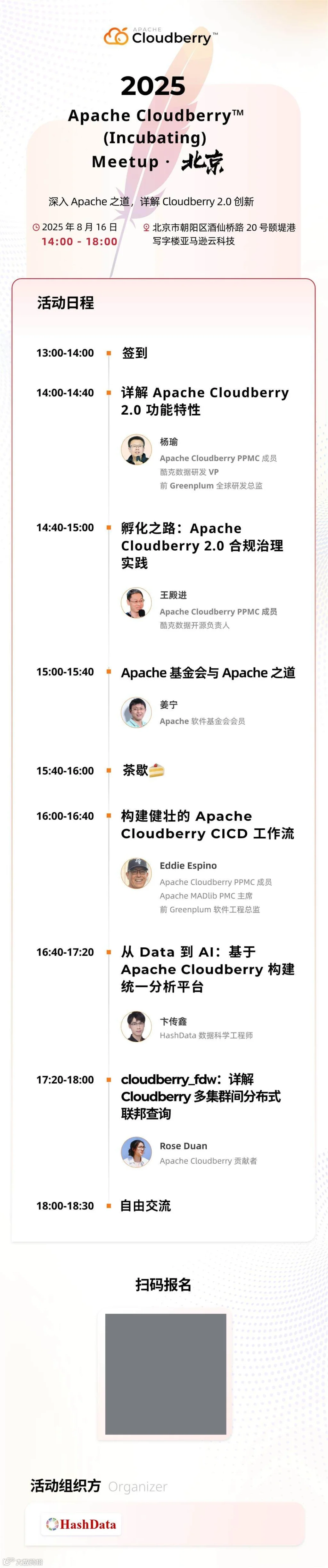 自成功进入 Apache 孵化器以来,Apache Cloudberry 社区迅速成长,吸引了来自全球的贡献者与使用者加入,共同推动项目向前发展。此次 Meetup,聚焦 Apache Cloudberry 2.0 新功能、新特性,同时也会重点分享 Apache Cloudberry 的开源合规实践、Apache 基金会与 Apache 之道,旨在帮助更多社区成员和伙伴深入理解如何通过开源推动项目健康发展,如何在全球化协作中持续释放创新力量。