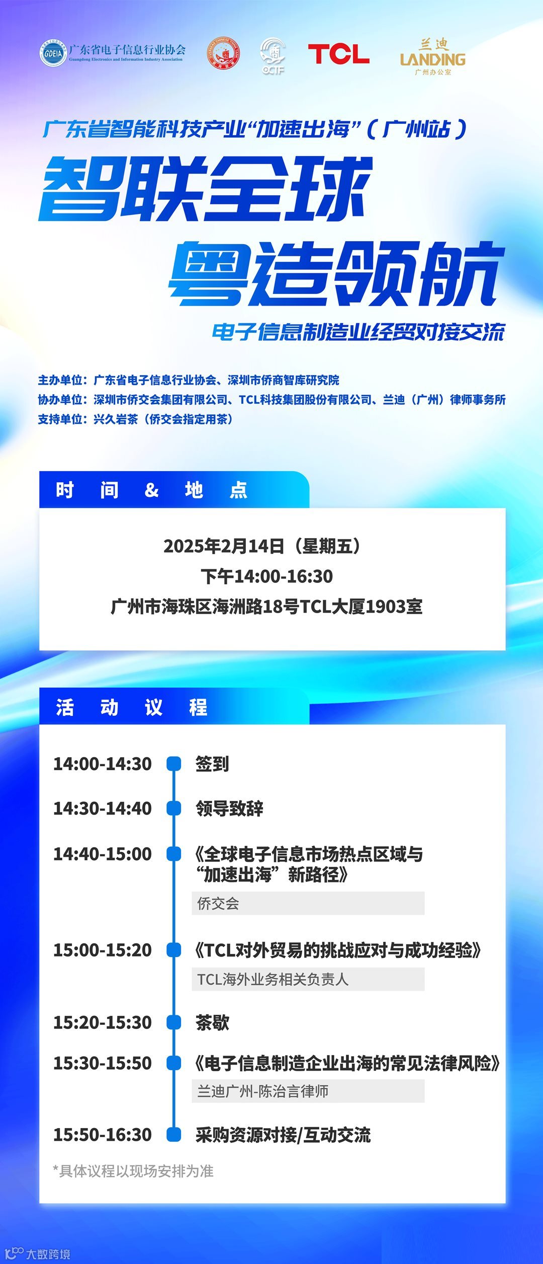 特别邀请来自侨交会、TCL、兰迪的企业高管进行海外市场需求解读、实操方案分享及风险应对策略,助力企业精准把握海外市场脉搏,拓宽国际业务版图。