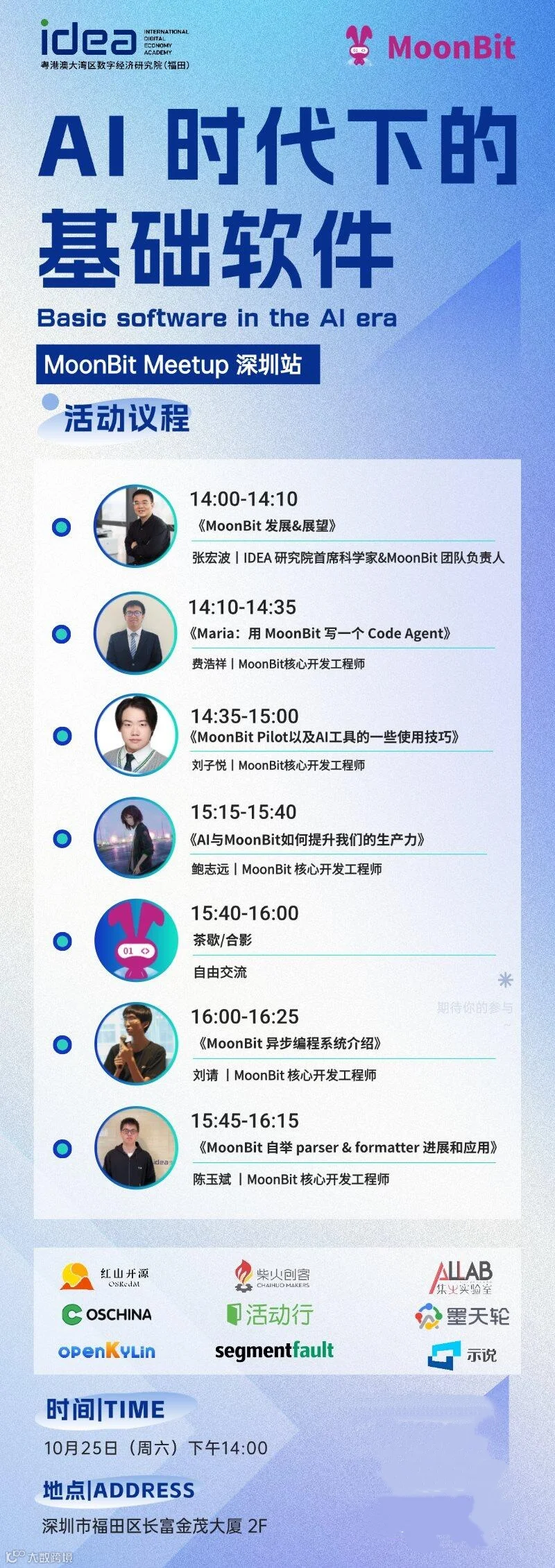 10 月 25 日(周六),欢迎来到深圳 MoonBit 技术沙龙,一起探讨AI 时代的基础软件新范式与编程语言的未来。