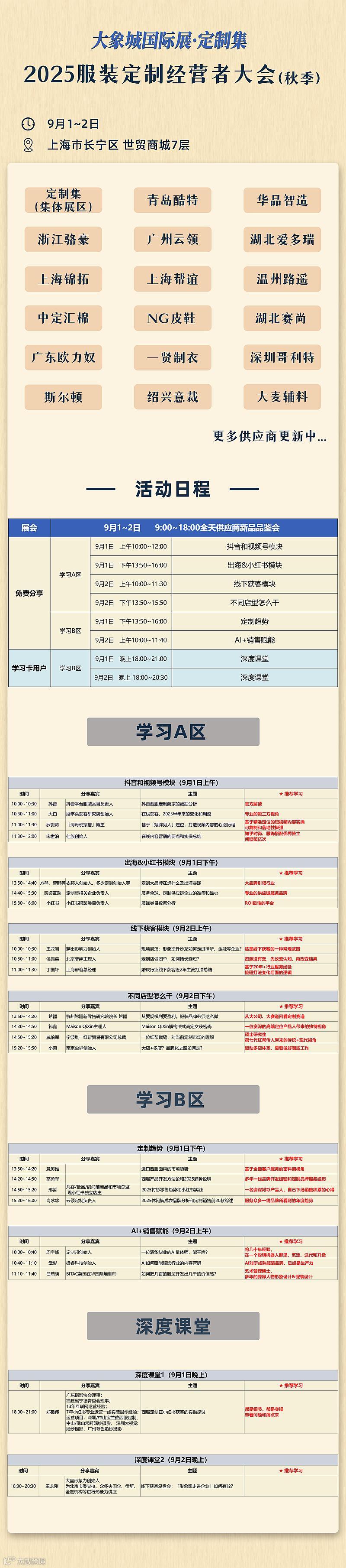 在9月1~2日,在上海,定制邦将以「精益破局」为主题,组织2025服装定制经营者大会(秋季),荟聚全国定制精英,输出近30场优质分享,与全国定制同行共同寻找当下市场环境下,定制难题的答案。