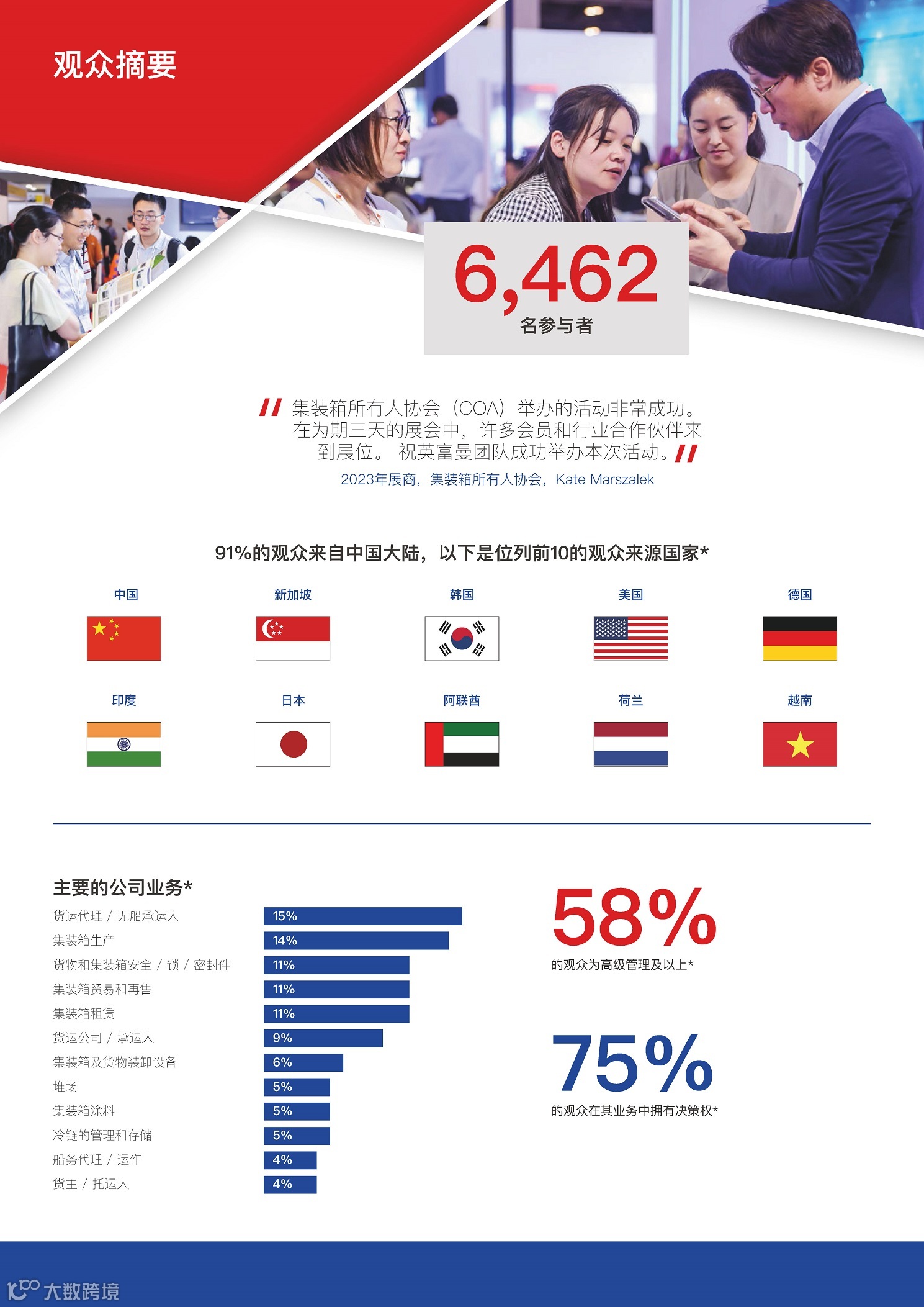 亚洲集装箱多式联运展览会每年都会汇集来自世界各地的资深业内人士,涵盖集装箱航运业的各个领域,包括航运公司、港口码头、航运代理、技术提供商、集装箱制造、集装箱贸易和物流服务提供商。