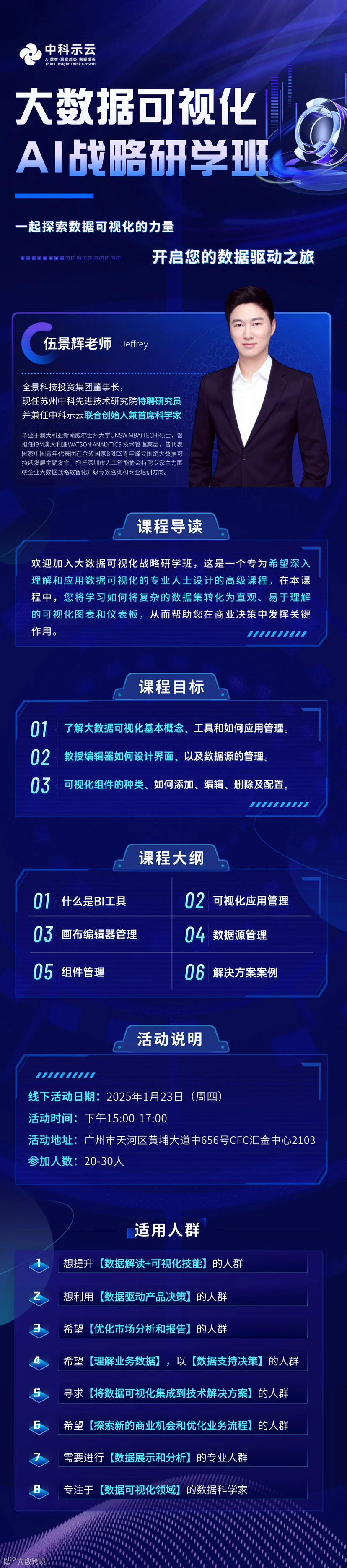 【大数据可视化AI战略分析研学班】来啦!这是一场聚焦大数据与AI深度融合的高端研学盛宴!我们将通过前沿的可视化技术,带你深入剖析战略决策背后的奥秘,让你的数据洞察力与决策效率瞬间飙升!无论是数据科学家、企业高管还是AI爱好者,这里都是你不可错过的成长平台。赶快加入我们,一起探索大数据与AI如何携手重塑未来决策新格局!