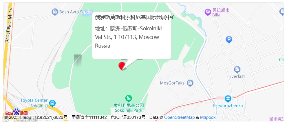 展馆地址: 欧洲-俄罗斯-Sokolniki Val Str,1 107113,Moscow Russia