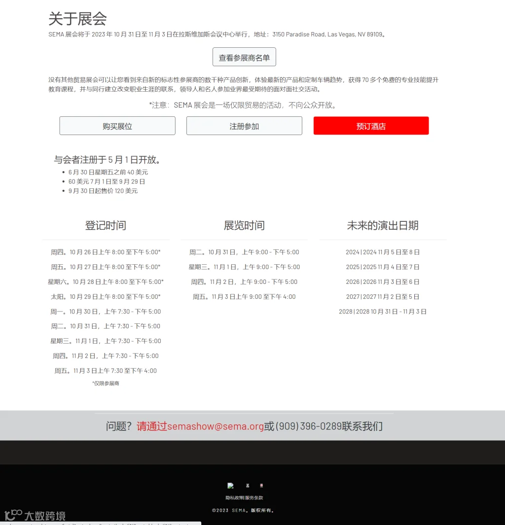 主办单位: 美国汽车用品改装车协会SEMA 展览面积: 130012.00平方 展商数量: 2525家 观众数量:159802人 举办周期: 1年1届