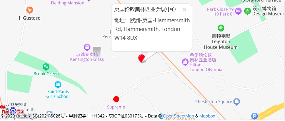 展馆地址:欧洲-英国-Hammersmith Rd, Hammersmith, London W14 8UX