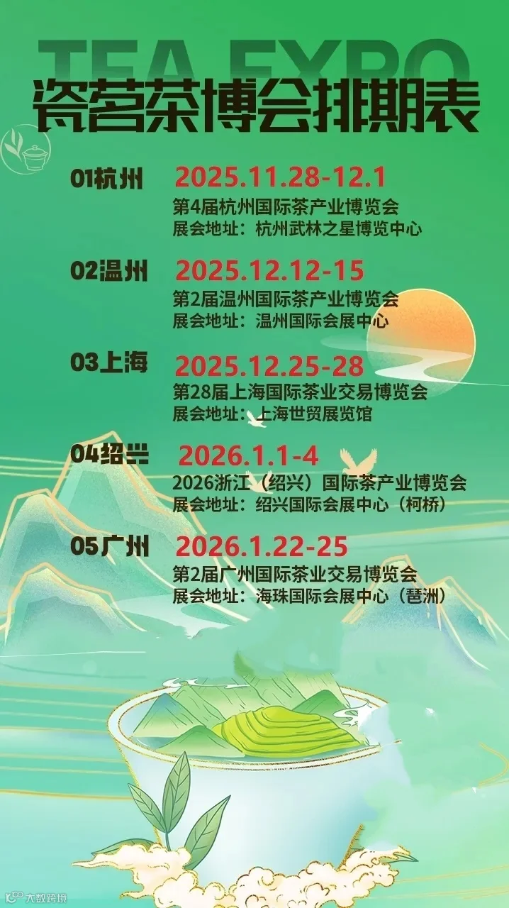 杭城入冬时,邀您品好茶!为进一步发挥杭为茶都的区位优势,借力入冬饮茶的市场季节需求,由上海瓷茗实业有限公司执行运营的第四届杭州国际茶产业博览会,将于11月28-12月1日在杭州武林之星博览中心举办。