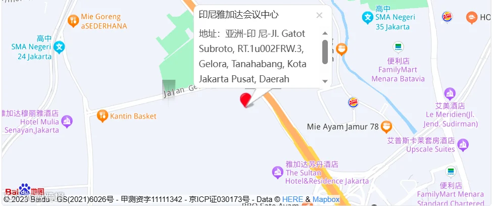 展馆地址:亚洲-印 尼-Jl. Gatot Subroto, RT.1u002FRW.3, Gelora, Tanahabang, Kota Jakarta Pusat, Daerah Khusus Ibukota Jakarta 10270印度尼西亚