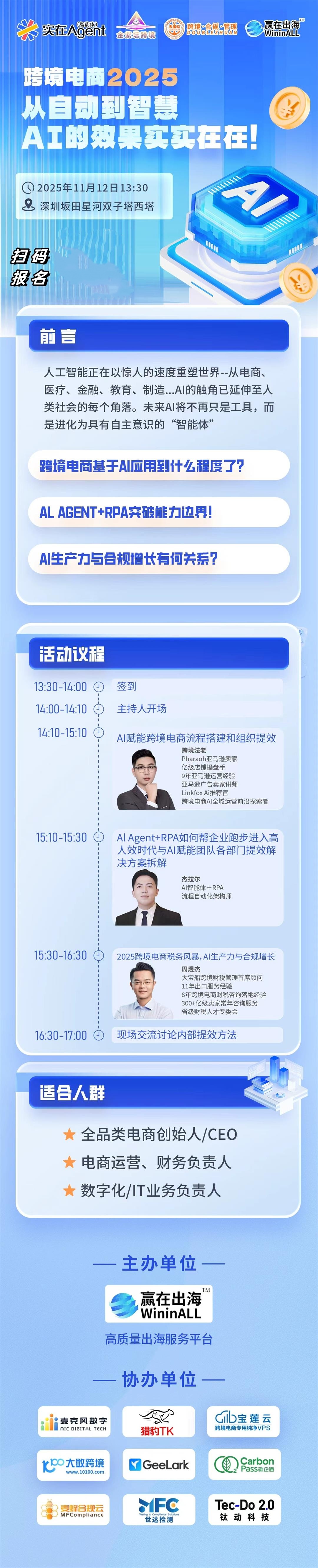 跨境电商基于AI应用到什么程度了?人机协作的未来是共生还是竞争?结合近期的社会资讯,如何更好的规划个人和企业在未来稳进发展,是每位跨境人的重要课题。想要了解AI知识领域的业内人事,可关注11月12号的跨境电商AI讲解活动。