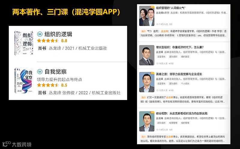 著有《组织的逻辑》、《自我觉察:领导力提升的起点与终点》两本代表作。