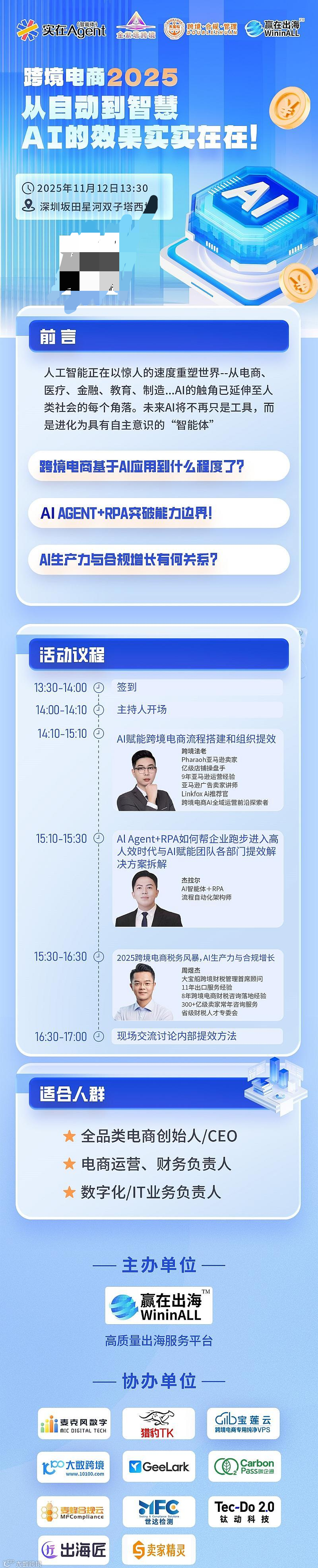 跨境电商基于AI应用到什么程度了?人机协作的未来是共生还是竞争?结合近期的社会资讯,如何更好的规划个人和企业在未来稳进发展,是每位跨境人的重要课题。想要了解AI知识领域的业内人事,可关注11月12号的跨境电商AI讲解活动。