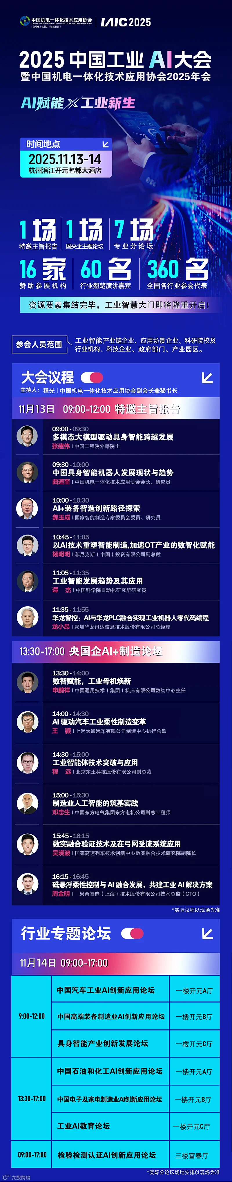 为深入贯彻《***关于深入实施“人工智能+”行动的意见》精神,抢抓人工智能发展新机遇,推动人工智能与工业深度融合,以AI+制造推动AI智能体深度赋能产业发展,中国机电一体化技术应用协会定于2025年11月12-14日在浙江省杭州市召开“中国工业AI大会(ICIA 2025)”。同期还将举办“中国机电一体化技术应用协会2025年会”“中国机电一体化技术应用协会七届三次常务理事会”“中国机电一体化技术应用协会具身智能分会成立大会”“中国机电一体化技术应用协会智能工厂分会换届大会”及“中国电子及家电制造业AI创新应用论坛”等七大专题论坛和人工智能有关团体标准启动会。