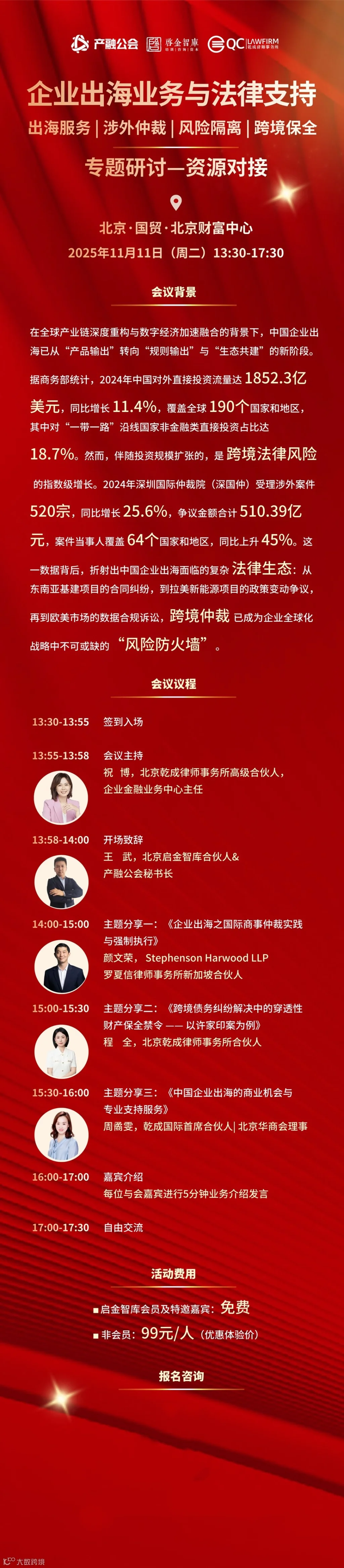 启金智库&产融公会 联合 乾成律师事务所 将于2025年11月11日(周二)下午14:00-17:30 在 北京 举办《企业出海业务与法律支持(出海服务|涉外仲裁|风险隔离|跨境保全)专题研讨一资源对接会》,欢迎您的加入!