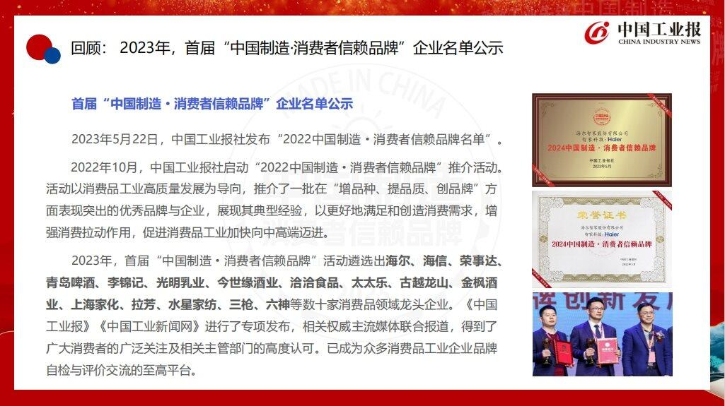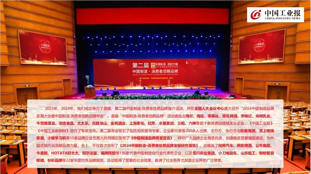 2023年、2024年,我们成功举办了首届、第二届中国制造·消费者信赖品牌推介活动,并在全国人大会议中心盛大召开“2024中国制造品牌发展大会暨中国制造·消费者信赖品牌年会”。首届“中国制造·消费者信赖品牌”活动遴选出海尔、海信、荣事达、青岛啤酒、李锦记、光明乳业、今世缘酒业、洽洽食品、太太乐、古越龙山、金枫酒业、上海家化、拉芳、水星家纺、三*、六神等数十家消费品领域龙头企业,《中国工业报》《中国工业新闻网》进行了专项发布。第二届年会吸引了包括相关领导专家、企业家代表等200余人出席,主办方、协办方与珍奥集团、掌上明珠家居、小猿学习机等10家品牌企业负责人共同倡议发布了《中国制造品牌质量宣言》,呼吁广大品牌企业携手共进,加速推进质量强国建设,为中国式现代化贡献品牌力量。会上,不仅首次发布了《2024中国制造·消费者信赖品牌发展研究报告》,还推选了问界汽车、燕京啤酒、公牛集团、HOTATA好太太、阿尔法蛋、福牌阿胶等一批代表中国制造业行业代表性企业,以及雪川集团、小刀电动车、山东临工、盼盼智能晾晒、杉杉品牌等22家年度优秀品牌案例,活动取得了显著的社会效果,赢得了社会各界尤其是企业界的广泛赞誉。