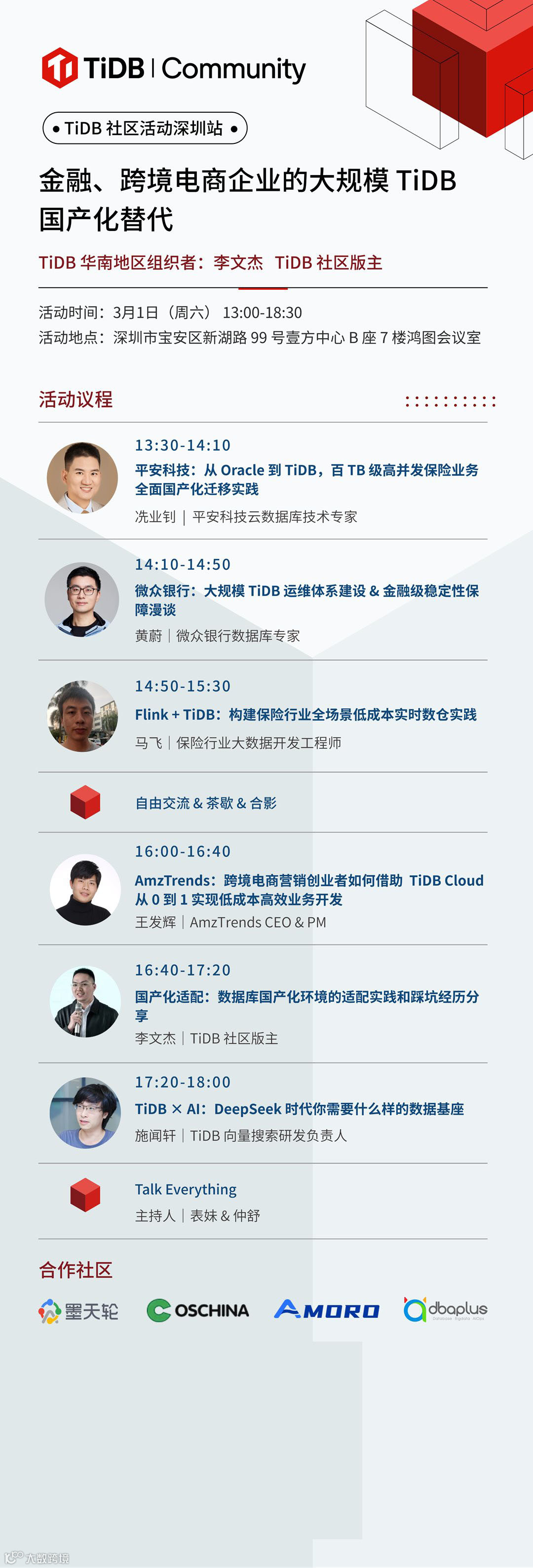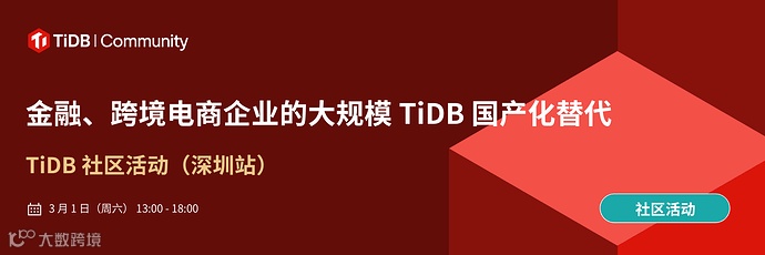 😎 大规模 TiDB 国产化替代怎么做?需要考虑哪些因素?替换收益如何?3 月 1 日,让我们相聚 TiDB 社区活动(深圳站),听听金融、跨境电商等行业的TiDB 用户分享,深度探讨国产化数据库迁移、大规模运维体系建设、稳定性保障、集群成本优化、低成本开发、国产化适配经验、TiDB 的 AI 能力等内容。