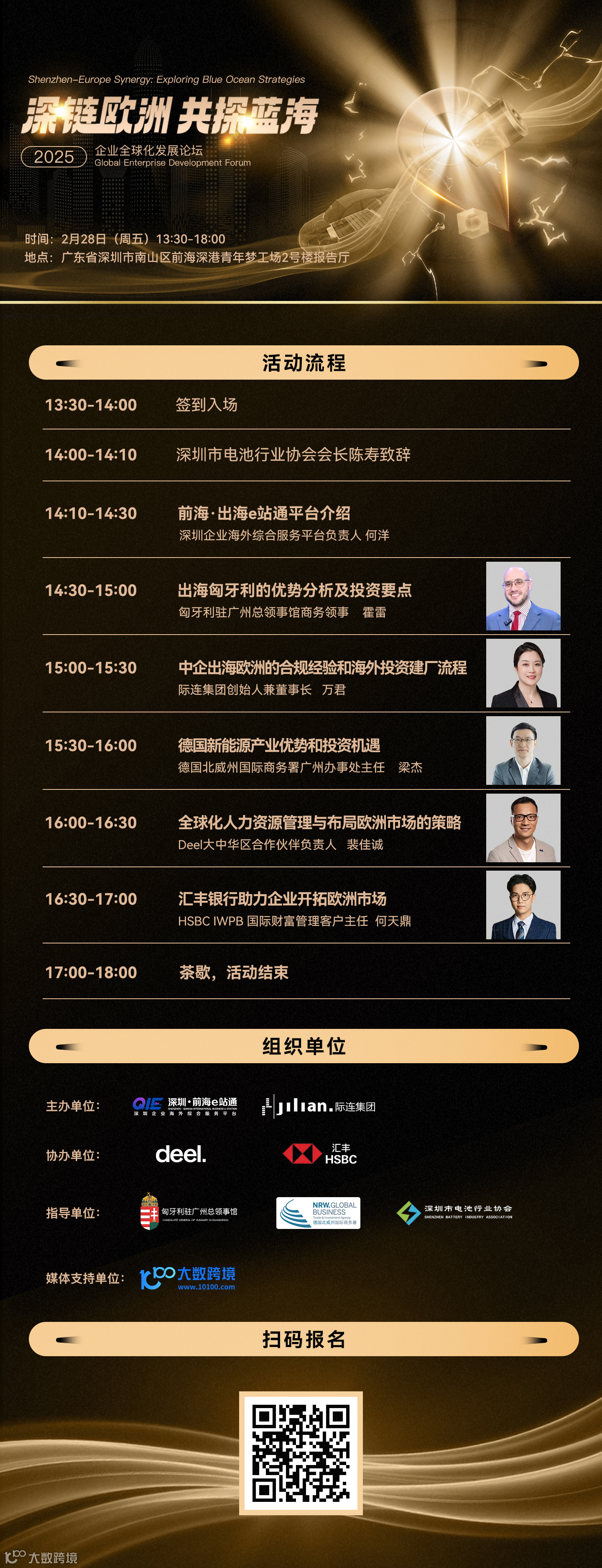 面对2025年的全新挑战与机遇,中国新能源企业亟需深化对欧洲市场的理解,精准布局,以技术创新和产品升级为核心驱动力,探索更多增长点。在此背景下,由前海出海e站通与际连集团携手主办,并得到深圳市电池行业协会鼎力支持的“深链欧洲,共探蓝海——企业全球化发展论坛”应运而生。本次论坛旨在搭建中欧电池产业链上下游企业、金融机构、法律机构及政府机构间的沟通桥梁,共同探索欧洲新能源市场的无限可能。