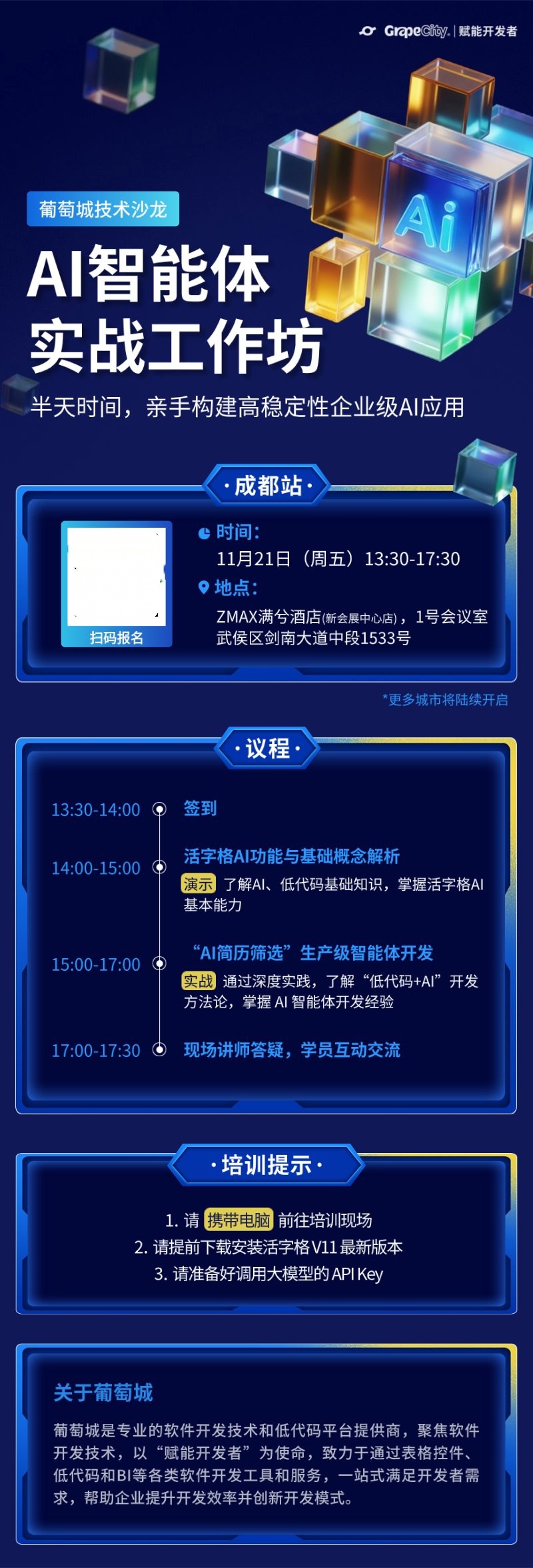 11 月21日(周五),成都站即将进行。葡萄城技术专家领衔授课,半天的沉浸式实战课程,涵盖从AI趋势洞察到具体应用场景解析,从基础知识讲解到活字格AI功能实操,确保每位参与者都能将所学即时转化为实践成果,名额有限,立即扫码报名吧!
