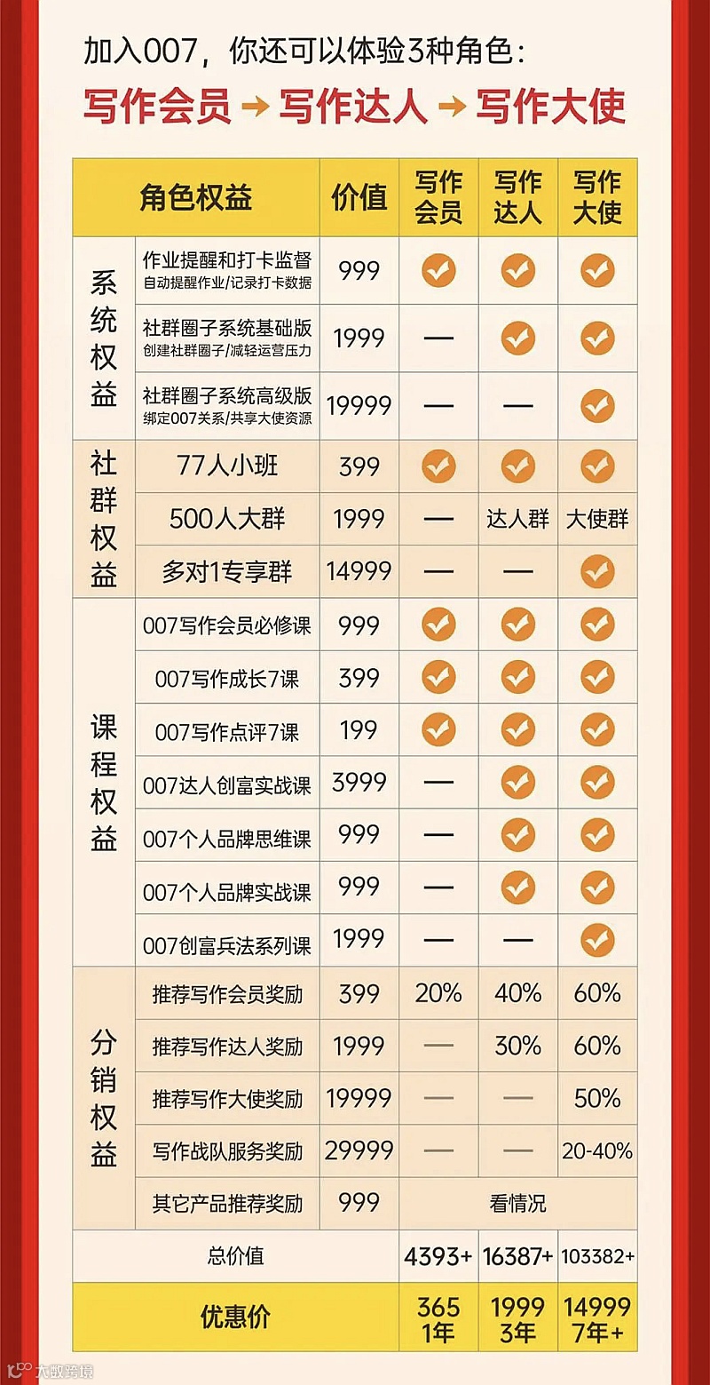 如果你是007全民写作大使、007写作达人、以上任何一种身份,这次都学费全免!!!
