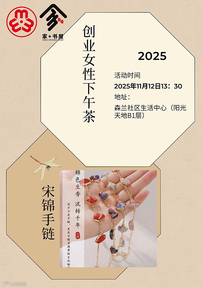 11月12日13:30,森兰社区生活中心(阳光天地B1层),家+书屋邀您共赴“锦色生香”之约。千年宋锦,经纬之间织就东方智慧;一条手链,方寸之内收藏文化自信。亲手穿珠引线,把故事戴在手腕,把优雅写进事业。创业路上,我们并肩同行,让传统与灵感在茶香里碰撞,让美丽与实力在午后闪闪发光。名额有限,报名从速,一起把岁月织成锦,把时光过成诗。
