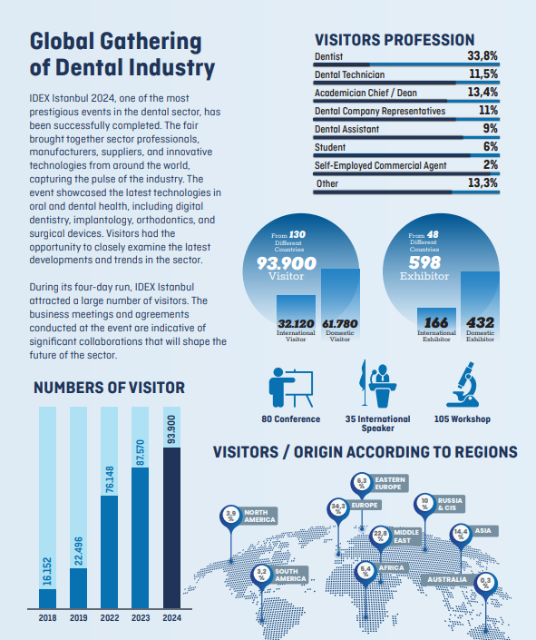 作为土耳其牙科和牙科行业的重要平台!伊斯坦布尔牙科及牙科展览会(IDEX ISTANBUL)为专业人士提供了一个了解最新技术、产品和服务的机会,促进了商业合作和行业发展。展会为展商提供了更大的商机,观众多为牙科贸易商和具有决策能力的牙科医生。