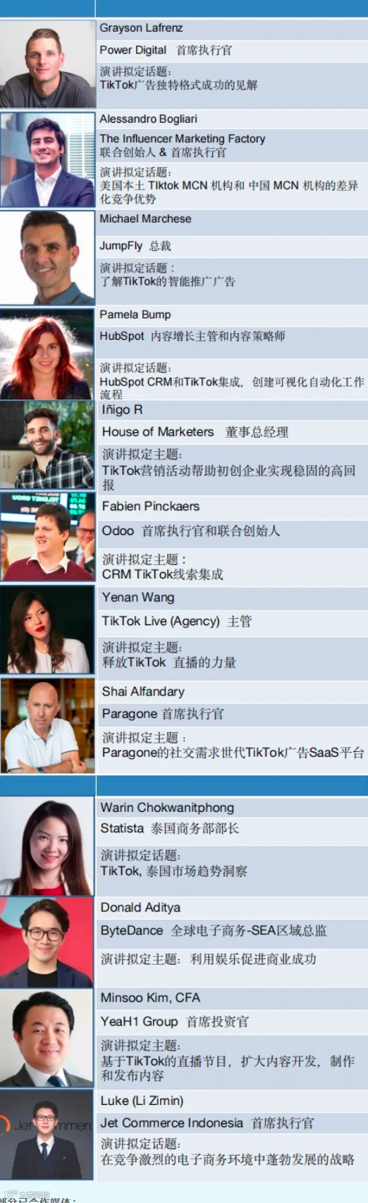 我们在研究和撰写TikTok 跨境电商市场研究报告的过程中,在近6个工作周中访谈了国内外超50家机构,包括老牌组织机构的创始人,更多的是异军突起的新秀企业代表,了解这些富有远见卓识的领导者们当下如何利用其核心竞争优势在现有的市场空间中竞争突围和取胜,剖析其成功案例,取其精华,归纳总结在我们的报告中。通过沟通和筛选,我们邀约了一些具有代表性的企业代表参加论坛并做主题分享。市场研究报告预计于8月初发布,并将在论坛上举行的报告发布会上展示。