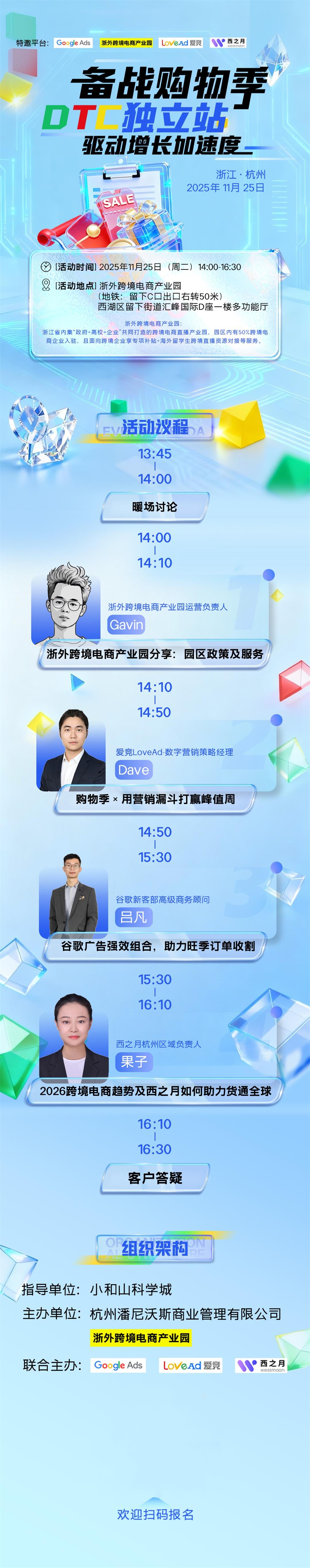 活动由浙外跨境电商产业园主办,Google Ads、LoveAd爱竞、西之月联合主办,议程包括园区政策及服务分享、购物季营销漏斗策略、谷歌广告组合助力旺季订单收割、2026跨境电商趋势及西之月助力货通全球等内容。浙外跨境电商产业园11月活动来了,Google谷歌DTC独立站活动西湖区值得期待。