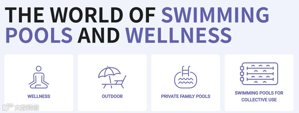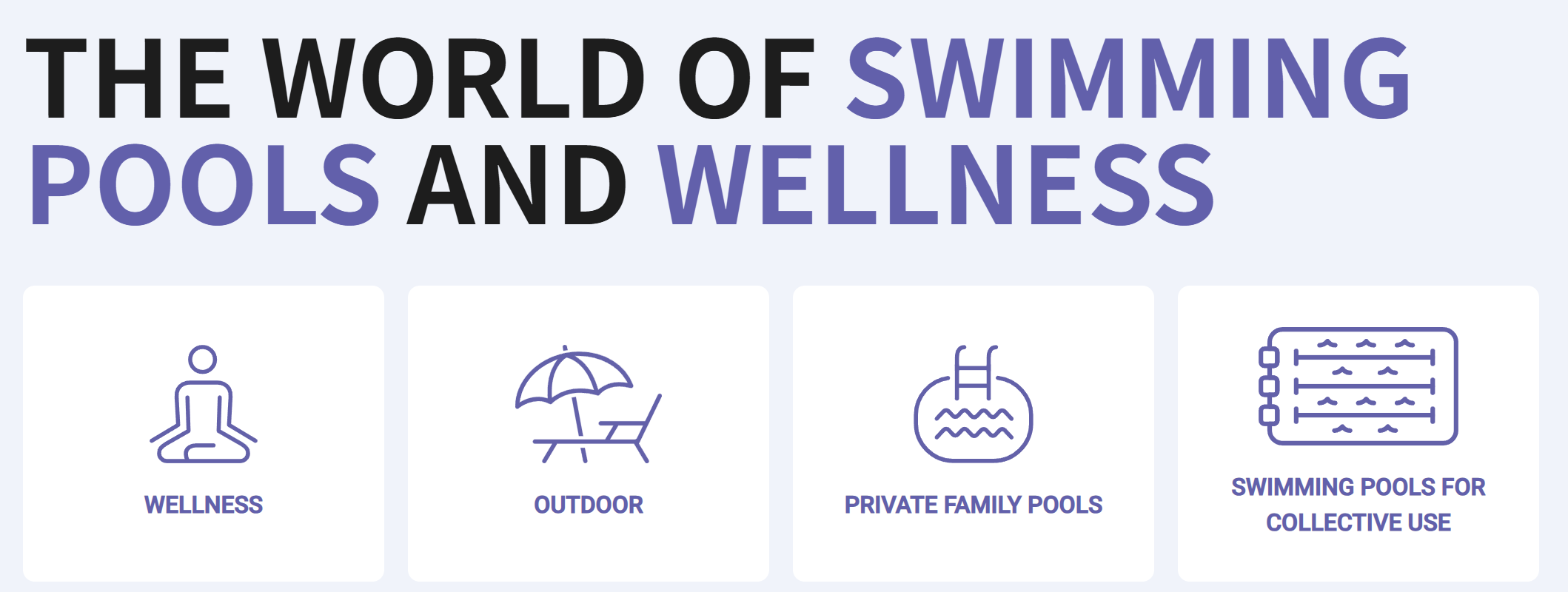 公共泳池和桑拿设施:成套泳池设备、泳池技术、泳池保养、泳池概念、泳池配件与设备、桑拿设施建造及规划、桑拿设施辅助设备、桑拿技术和桑拿附件等;