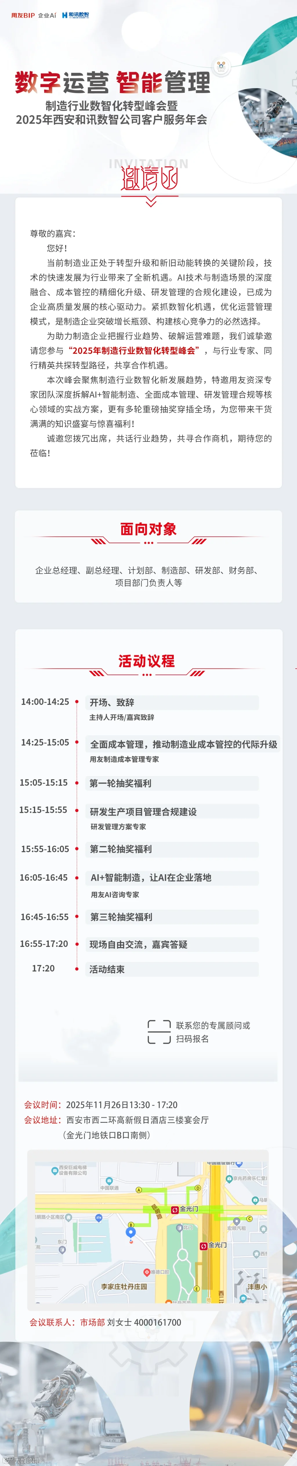 当前制造业正处于转型升级和新旧动能转换的关键阶段,本次峰会聚焦制造行业数智化新发展趋势,特邀用友资深专家团队深度拆解AI+智能制造、全面成本管理、研发管理合规等核心领域的实战方案,助力制造企业把握行业趋势、破解运营难题。