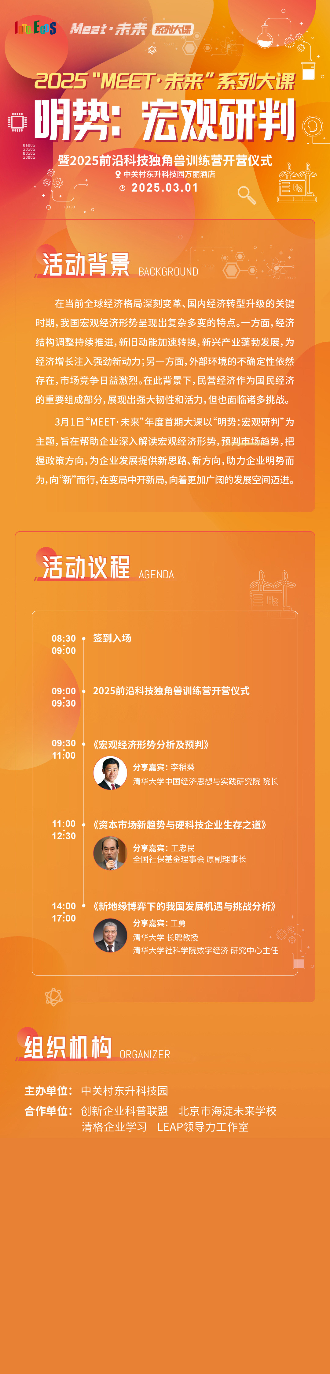 3月1日“MEET·未来”年度首期大课以“明势:宏观研判”为主题,旨在帮助企业深入解读宏观经济形势,预判市场趋势,把握政策方向,为企业发展提供新思路、新方向,助力企业明势而为,向“新”而行,在变局中开新局,向着更加广阔的发展空间迈进。