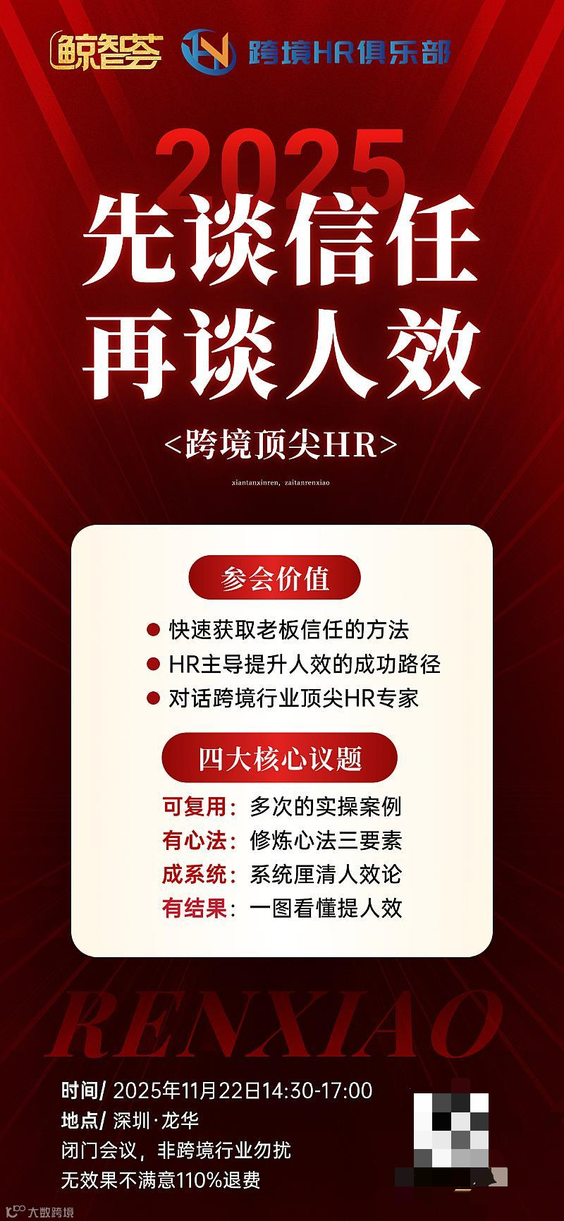 ②晚宴:19点开始。地点:清湖小院V15。2025年赞助商经费3万元【本HR俱乐部、钟长生(川日国际)、李懿晋(路易电商)、余林(跨海鹰)、李昭谊(同业集团)、潘豪杰(GALLEY出海用工)、余小鱼(九九租)】