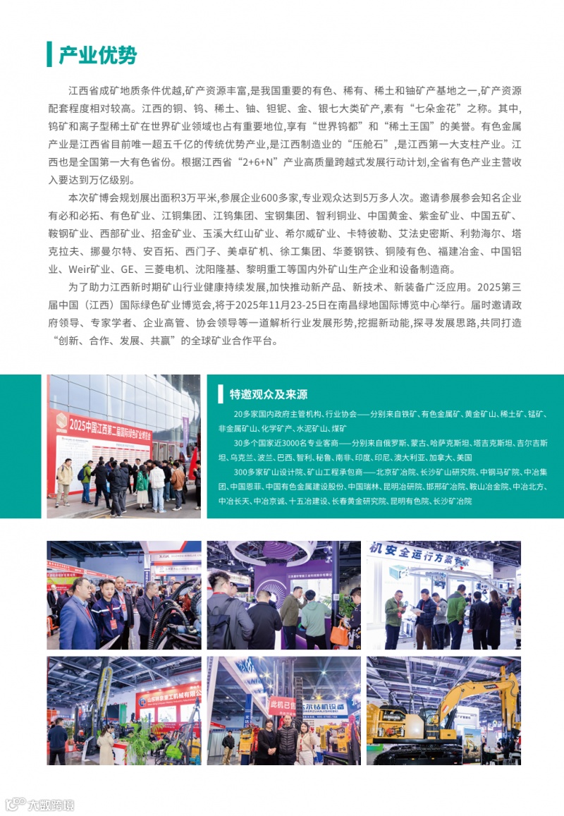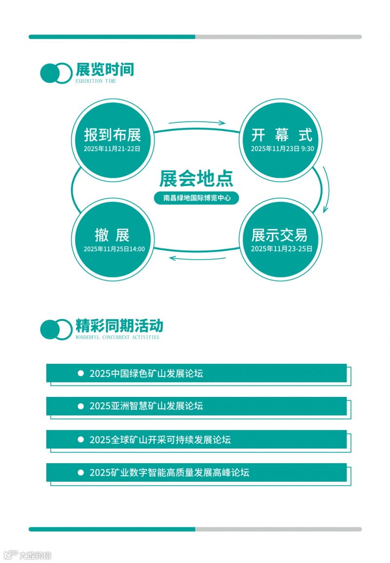 为了助力江西新时期矿山行业健康持续发展,加快推动新产品、新技术、新装备广泛应用。2025第三届中国(江西)国际绿色矿业博览会,将于2025年11月23 - 25日在南昌绿地国际博览中心举行。届时邀请专家学者、企业高管、协会领导等一道解析行业发展形势,挖掘新动能,探寻发展思路,共同打造“创新、合作、发展、共赢”的全球矿业合作平台。
