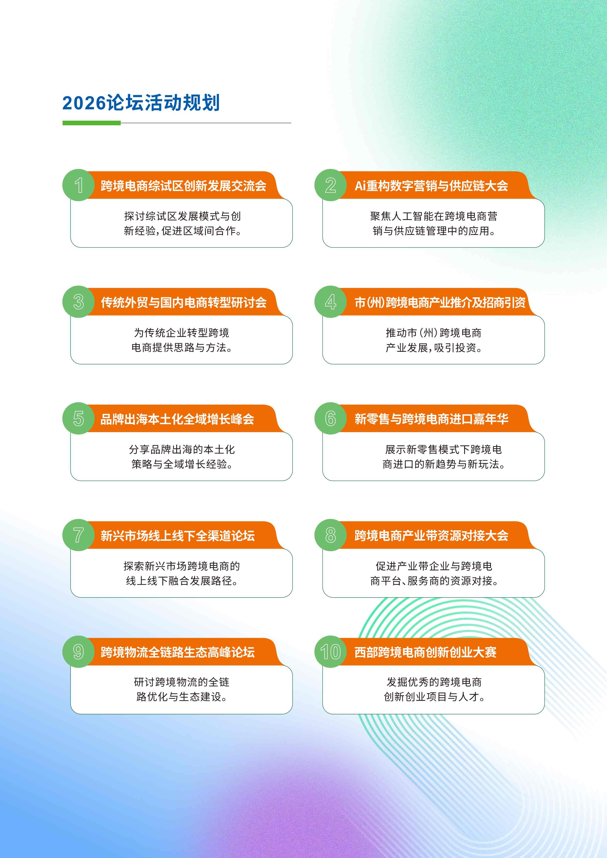(四) 跨境电商综合服务:全面展示外贸综合服务、国际物流、海外仓、金融支付、财税合规、海外营销、软件工具等专业服务企业,以及人工智能等行业热门新兴应用。