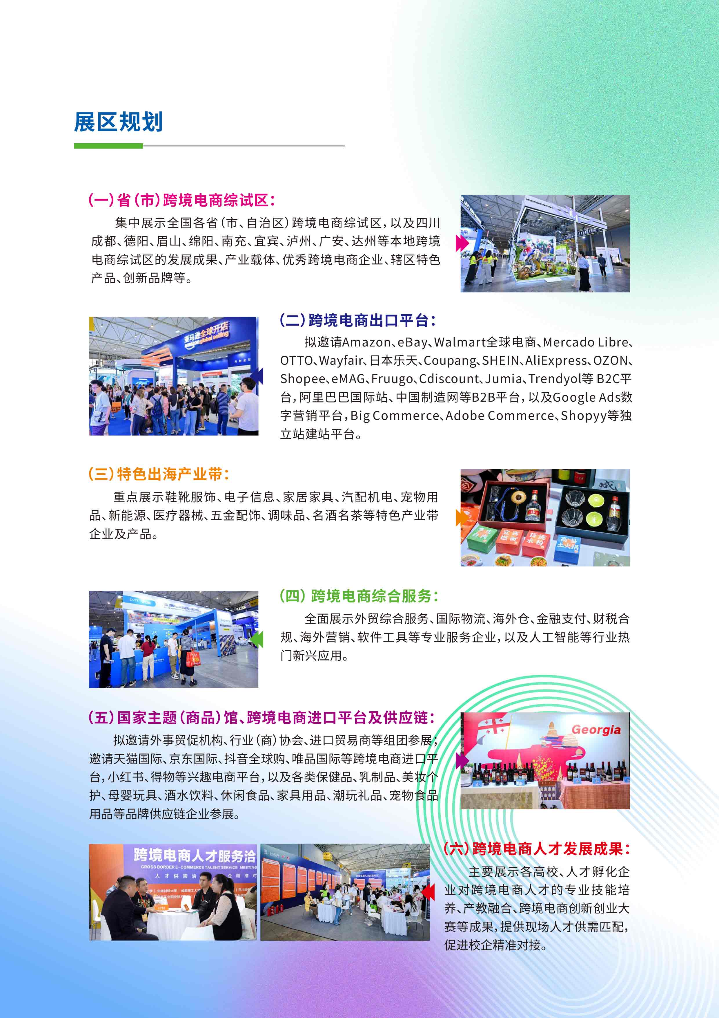 (一) 省(市)跨境电商综试区:集中展示全国各省(市、自治区)跨境电商综试区,以及四川成都、德阳、眉山、绵阳、南充、宜宾、泸州、广安、达州等本地跨境电商综试区的发展成果、产业载体、优秀跨境电商企业、辖区特色产品、创新品牌等。