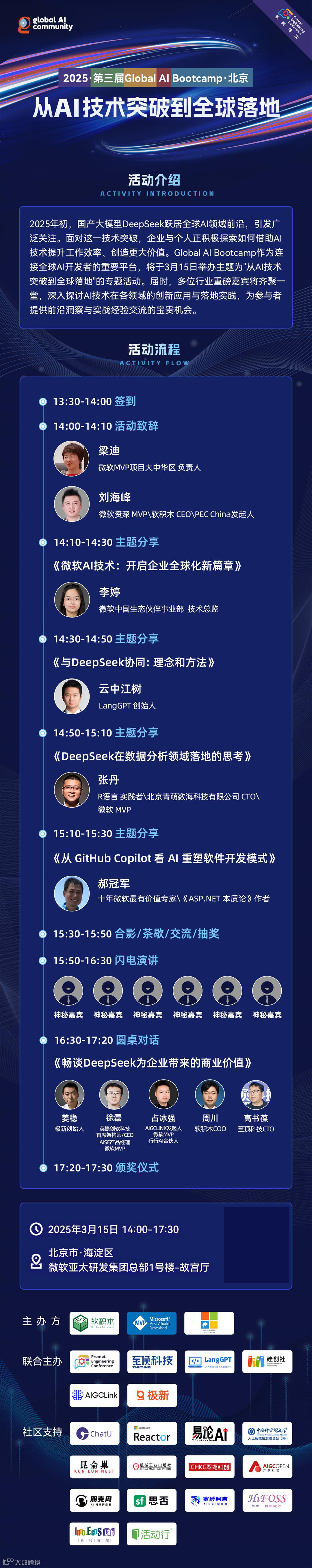 自2023年起,软积木联合微软直通车在中国成功举办多次线下活动,获得行业热烈反响,为进一步聚焦AI技术前沿洞察,推进AI实际应用,我们计划3月15日于在北京微软中国研发集团总部推出Global AI Bootcamp活动。此次盛会将邀请多位AI行业重磅嘉宾深入探索AI服务在不同领域的应用潜力。