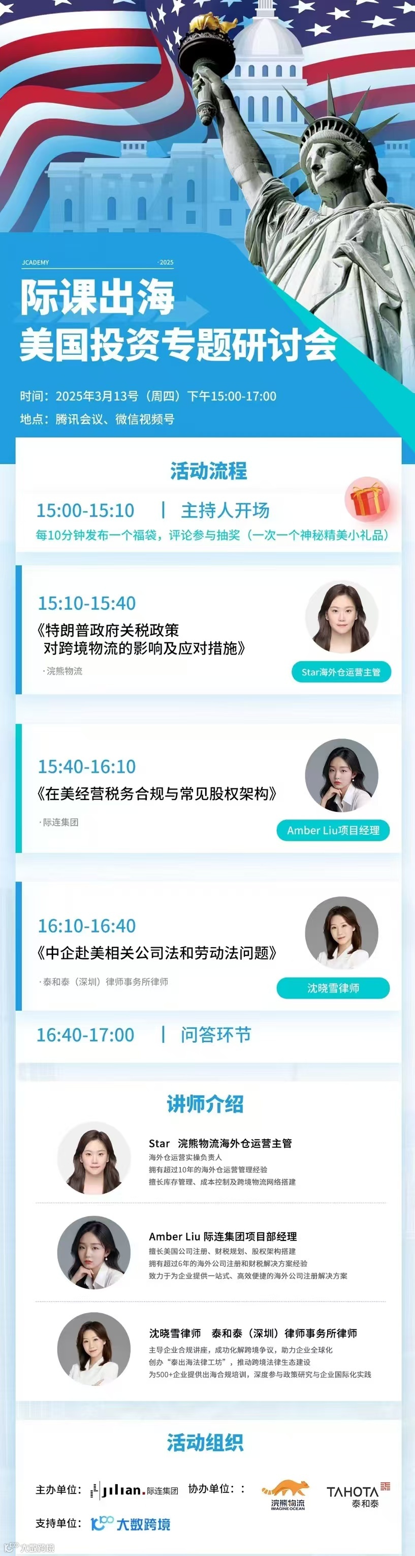 面对这一局势,高额关税与贸易壁垒不仅加剧了中国企业在美国市场的竞争压力,同时也成为推动中国企业加速转型升级、探索新发展机遇的强大动力。为了帮助企业更好地应对特朗普贸易政策下的挑战和机遇,合规入驻美国市场,际连集团联合泰和泰(深圳)律师事务所和浣熊(上海)国际物流特此举办本次分享交流活动。