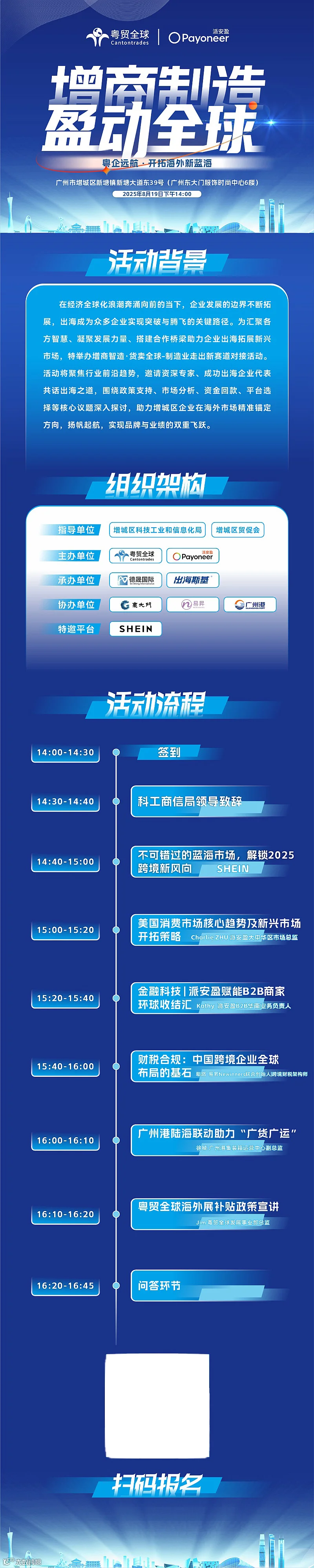 本次活动以 “增商智造・货卖全球” 为主题,于 2025 年 8 月 19 日在广州市增城区举办,旨在汇聚各方智慧、搭建合作桥梁,助力增城区企业出海拓展新兴市场,深入探讨政策支持、市场分析、跨境资源共享等核心议题。特邀 SHEIN、派安盈、易昇、广州港、粤贸全球等机构代表,围绕蓝海市场趋势、消费市场策略、财税合规等内容展开分享与交流。