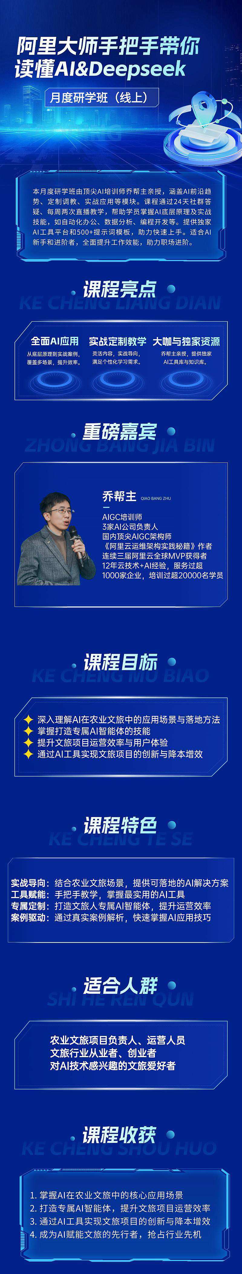 课程涵盖AI底层原理、工具使用、场景应用、案例解析及长期战略,帮助学员系统掌握AI赋能文旅的全流程。