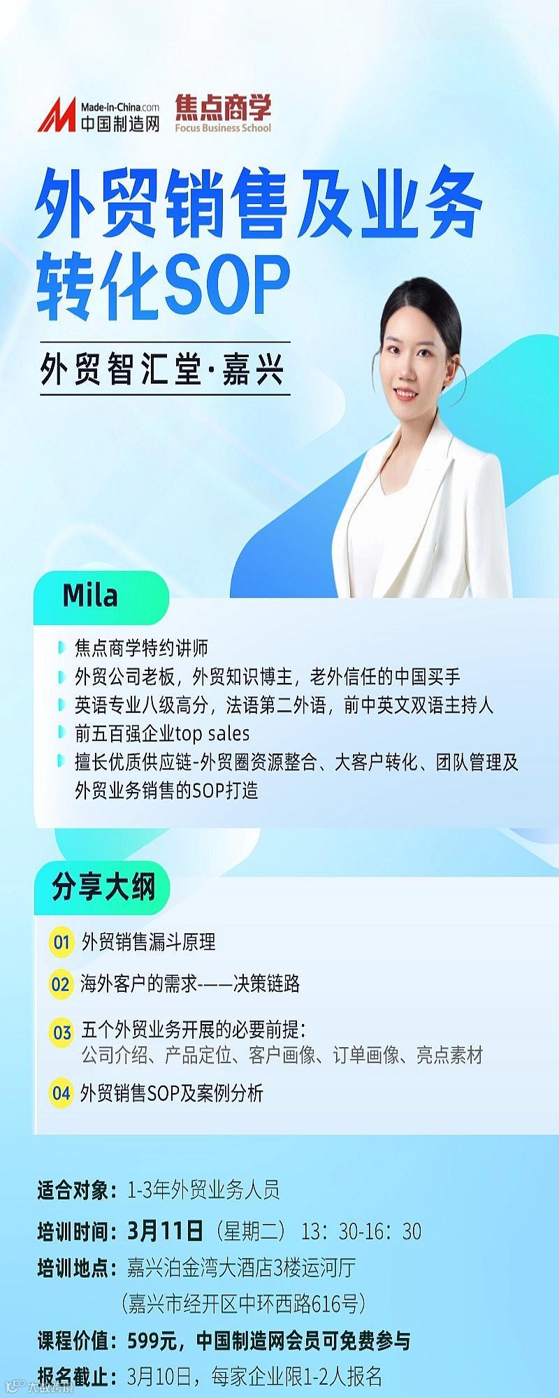外贸人都知道,外贸实务操作比如贸易术语、付款方式、物流都是有SOP的,那么外贸销售和业务转化有没有标准流程或公式呢?或者有没有什么好的方法来快速达成业务转化?今天我们一起来听听外贸高手Mila老师结合自己外贸实战经历及丰富的真实实例,提供独家外贸销售及业务转化SOP,成功拿下大客户!