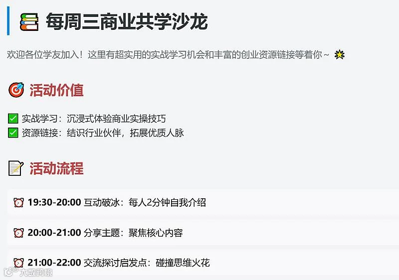社群通过每周三组织线下共学沙龙的形式,让创业者深度交流行业发展、业务创新、资源合作等话题,推动老板们在圈子里收获真链接、真助力。