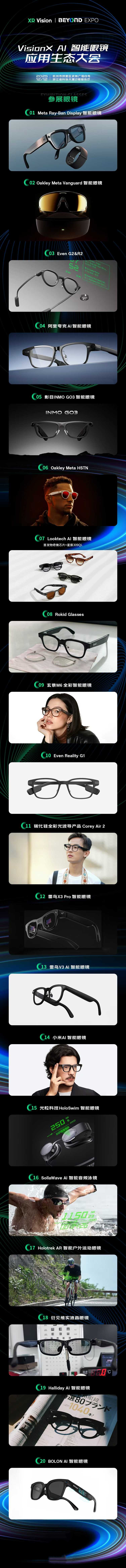 体验设备:Meta Rayban Display、影目GO3智能眼镜、Halliday、Corey Air 2(拟邀请)、Oakley Meta Vanguard、夸克AI智能眼镜(待定)、魅族StarV Snap、微光科技玄景M6智能眼镜、形意智能AR99(待定)、Rokid Glasses、Looktech AI智能眼镜、大朋AI智能眼镜、雷鸟X3 Pro智能眼镜、逸文科技G1智能眼镜、逸文科技G2&R2