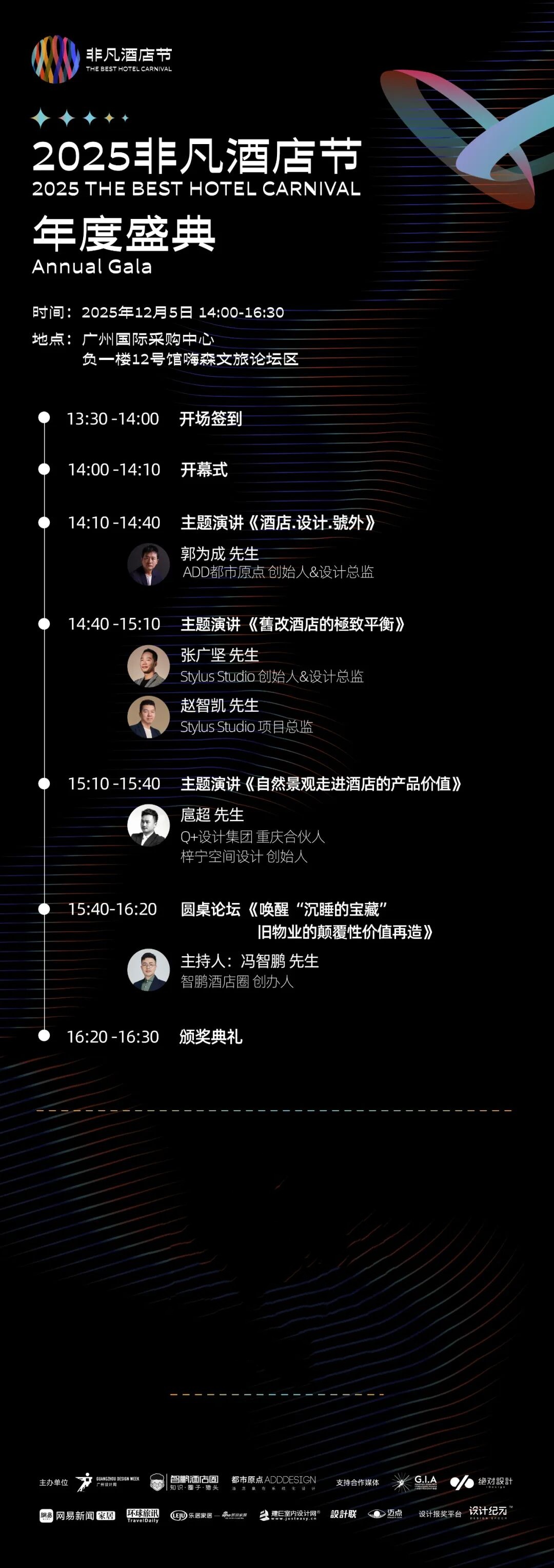 2025非凡酒店节(2025 THE BEST HOTEL CARNIVAL)由广州设计周、智鹏酒店圈及ADD都市原点酒店设计机构联合发起,是酒店业年度盛会。活动聚焦酒店运营、空间设计与客户体验,精选杰出主题酒店、品牌及人物。汇聚500+行业精英、酒店设计师及资深投资人,搭建酒店知识分享与人脉交流平台,以创新运营模式与设计力量推动行业发展。