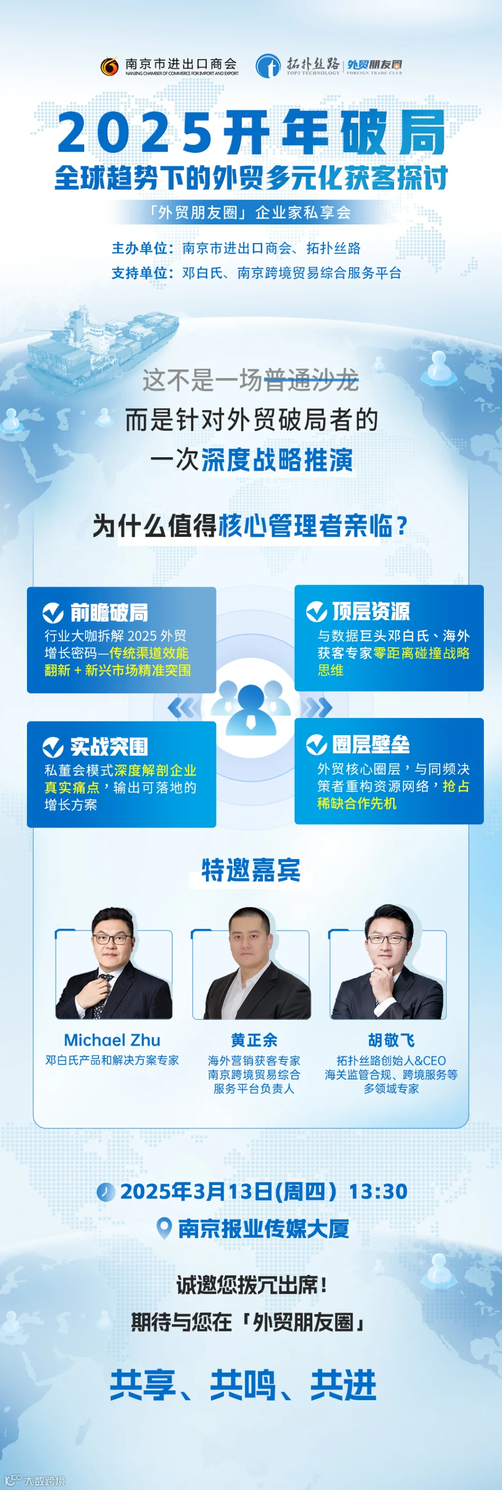 在全球化与数字化的双重浪潮下,外贸行业正面临前所未有的变革。传统 B2B 平台流量成本高企,新兴市场信息不对称问题突出,企业数字化营销能力亟待提升。2025 年,外贸企业如何在全球竞争中破局而出,抢占先机?本次「外贸朋友圈」企业家私享会将聚焦这一主题,助力企业精准把握海外市场脉搏,拓展获客渠道,加速业务增长。