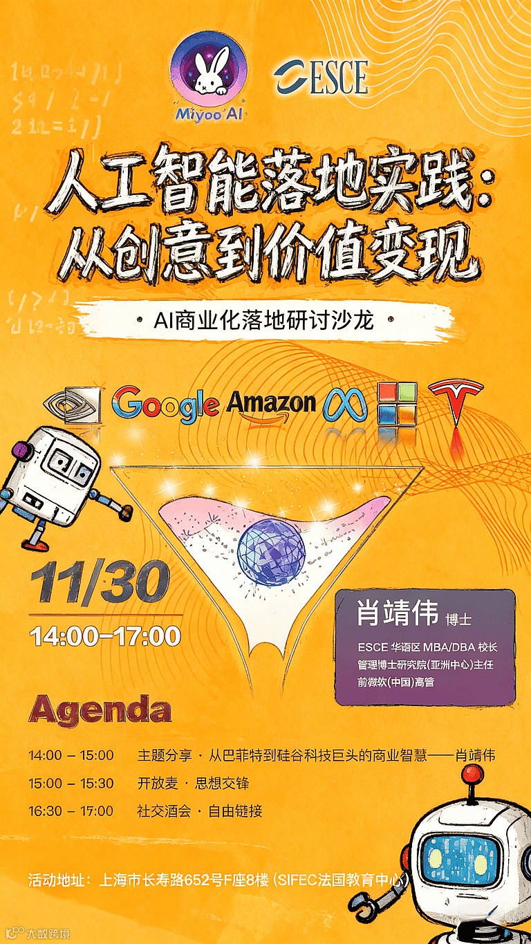 ESCE华谊区MBA校长肖靖伟博士(前微软高管)亲授:从巴菲特逻辑到硅谷巨头打法,教你把AI创意变成实际收益——避免踩“技术好看但不赚钱”的坑。