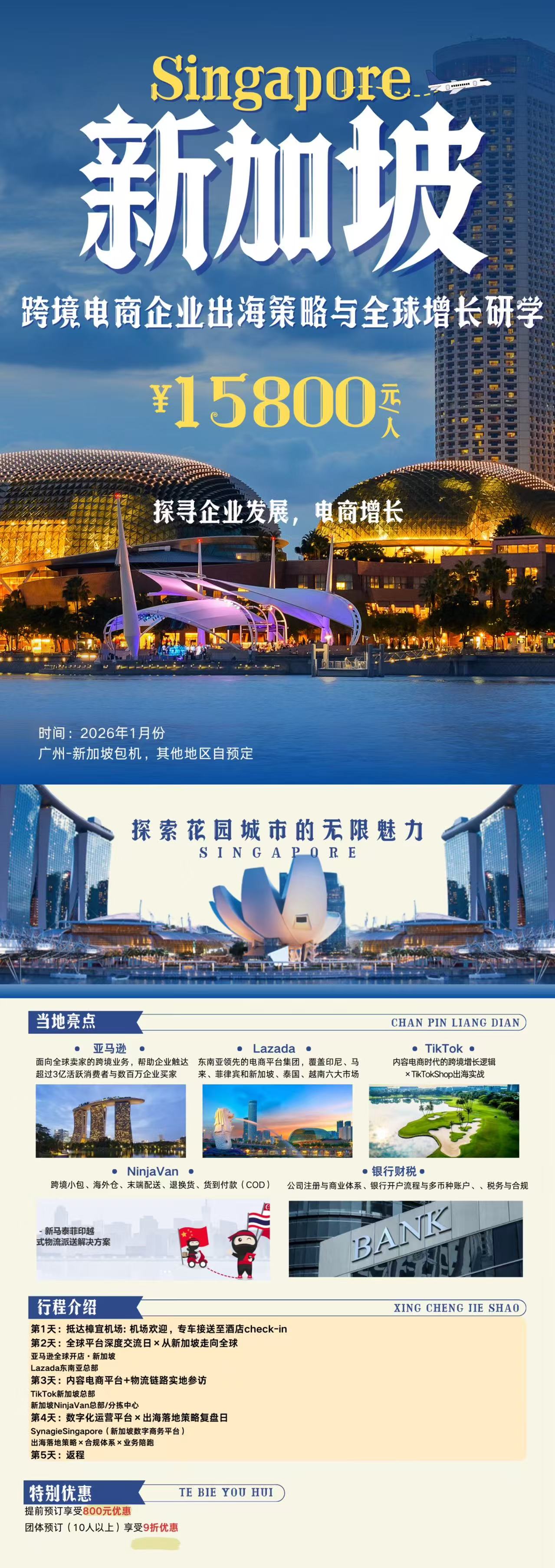 新加坡跨境电商企业出海策略与全球增长研学活动,包含全球平台深度交流、内容电商平台与物流链路实地参访、数字化运营平台与出海落地策略复盘等内容,涉及亚马逊、Lazada、TikTok、NinjaVan等企业。含新加坡当地交通、研学课程与餐饮酒店五天四晚15800元