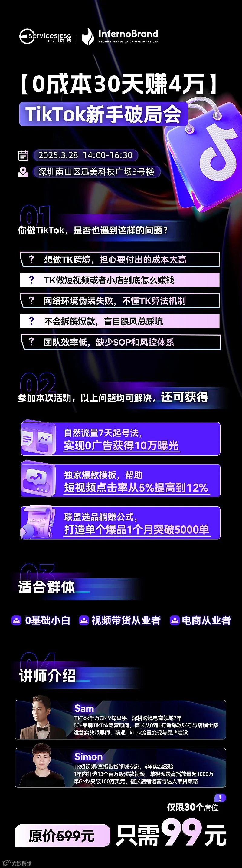 1.活动满30人开办,如报名未满30人,活动会取消或延期,相关通知会通过短信通知2.活动最终地址,报名后会通过短信通知,请注意查看短信消息3.活动最终解释权归ESG跨境所有
