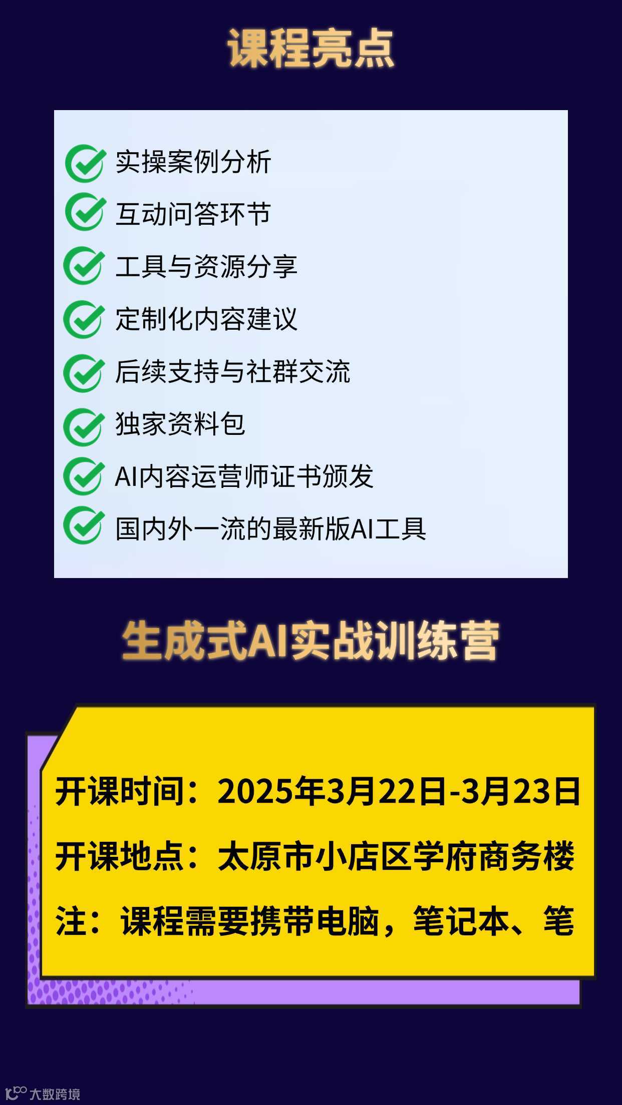 Ai时代来啦!!全国各地大一些的城市都在用Ai办公了,山西太原也要紧跟上3月22-3月23日为期两天特训营在山西太原开展。诚邀各位职场人士、学校老师、大学生、想兼职的宝爸宝妈特来报名参加~