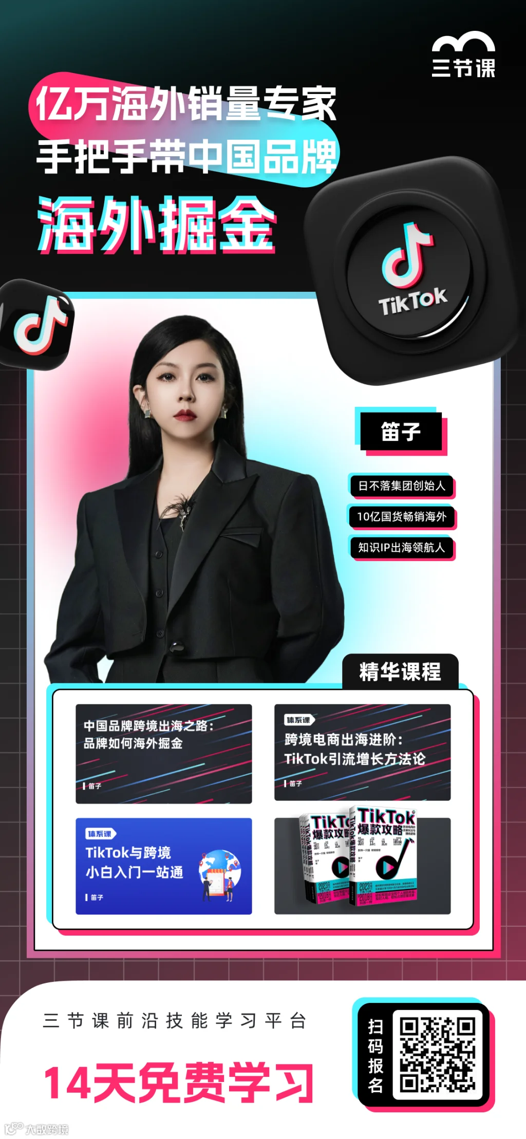 ✅ 三节课特别推出【海外掘金专题课程】,特邀亿万海外营销专家-笛子,深度解析中国品牌海外掘金策略及tiktok流量变现方法论。