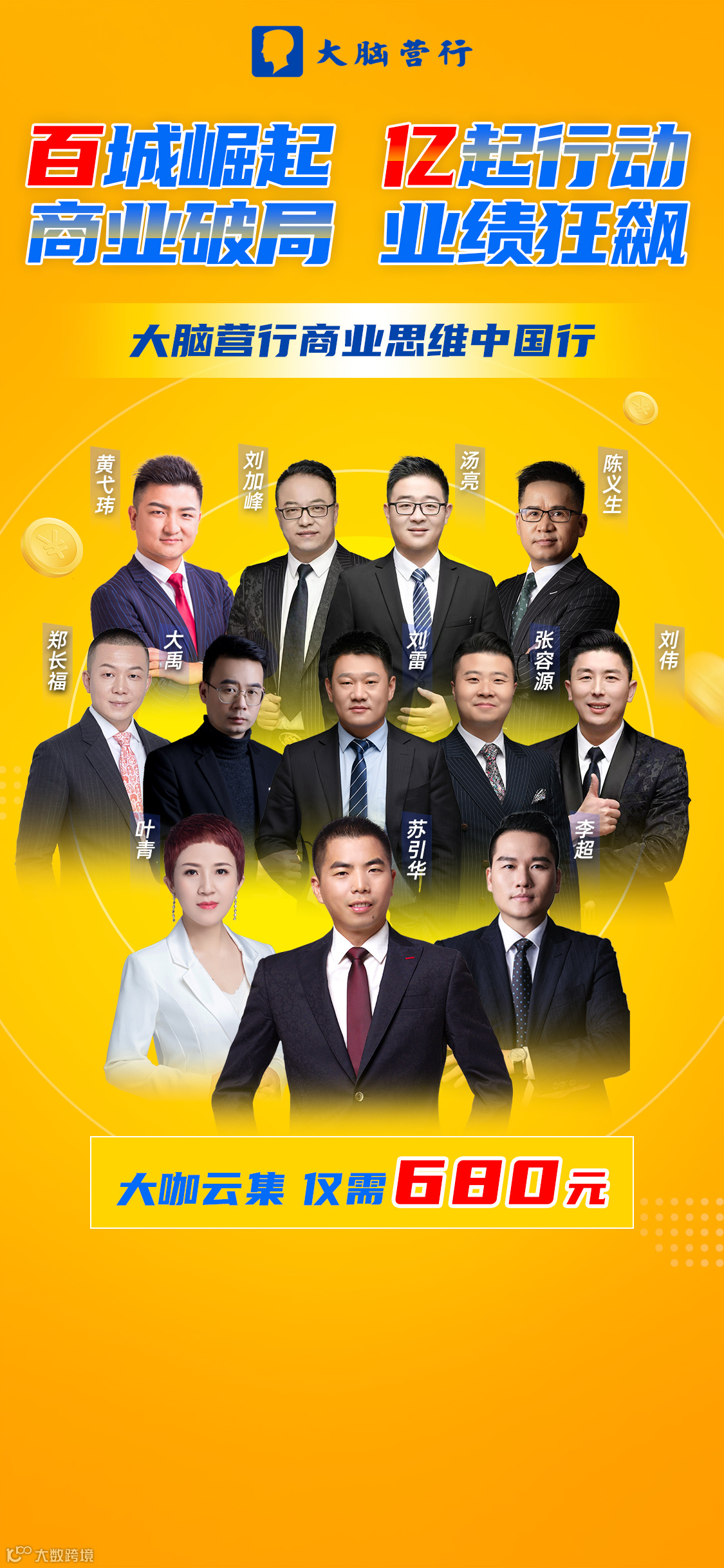 为了实现我们“帮助1000万中小企业实现业绩增长”的目标,所以我们推出了【百城崛起,亿起行动】——大脑营行商业思维中国行计划,将在全国各地推出100场《业绩狂飙》课程!助力更多中小企业实现业绩突破亿元大关!