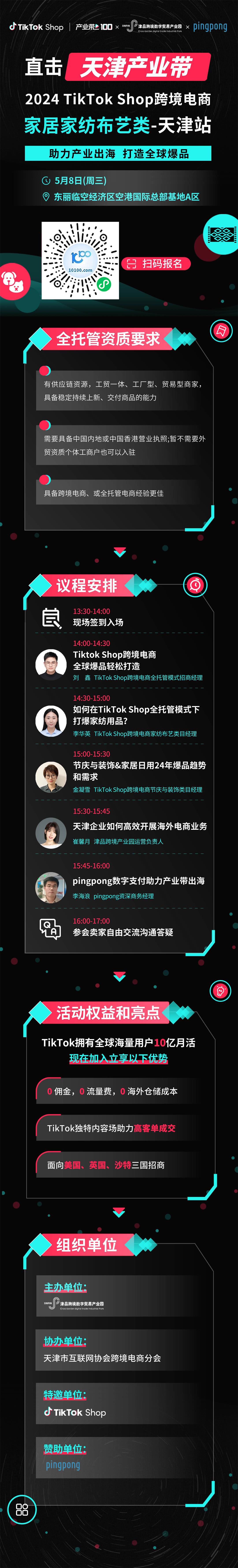 最近,TikTok Shop跨境电商正式启动了“产业带100计划”,2024年将走入超过100个产业带,助力商家打造超10000个全球爆品。本次津品跨境将主办天津站活动,5月9日直击京津冀家居等其他特色产业带。TikTok Shop跨境电商各品类经理首次来到天津,交流机会非常难得!!!此次活动会全方位讲解2024 TikTok Shop跨境电商全托管&孵化模式,着重分析家居、纺织品、宠物等品类的重点平台打法。新平台、新玩法、新蓝海市场、天津首次,京津冀跨境卖家及实力工厂你还在等什么!!!
