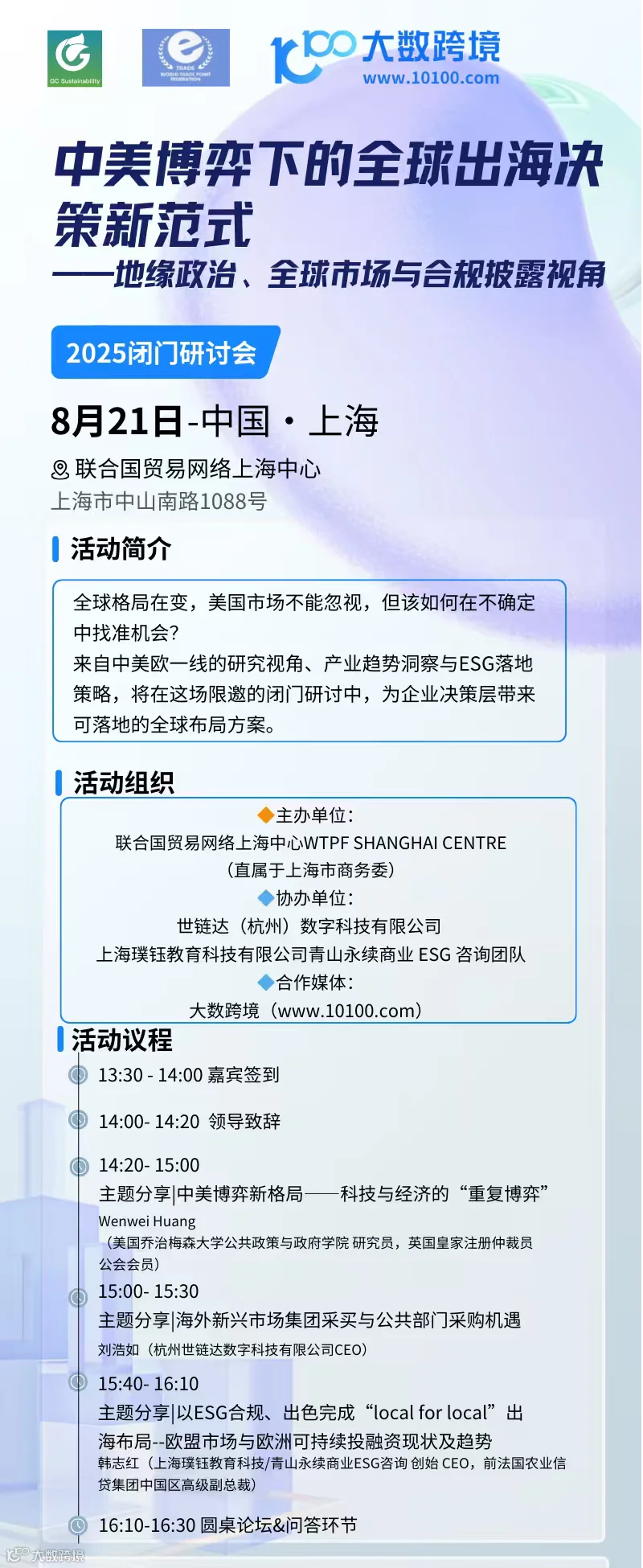 由联合国贸易网络上海中心WTPF SHANGHAI CENTRE(直属于上海市商务委)主办,世链达(杭州)数字科技有限公司、上海璞钰教育科技有限公司青山永续商业ESG咨询团队共同协办,主题为「中美博弈下的全球出海决策新范式——地缘政治、全球市场与合规披露视角」闭门研讨会应运而生。
