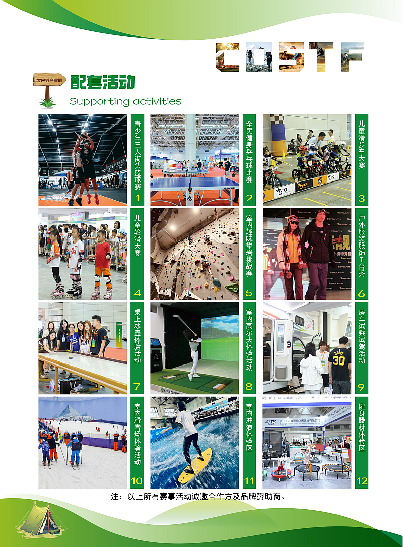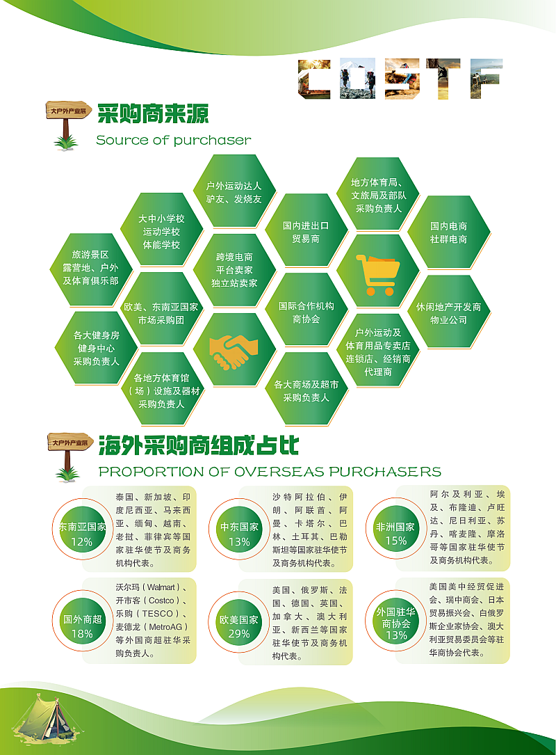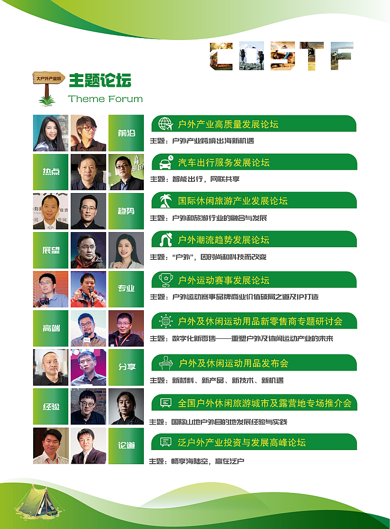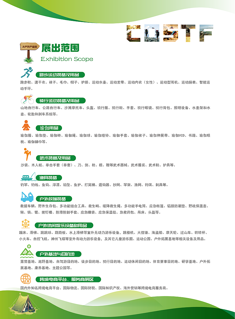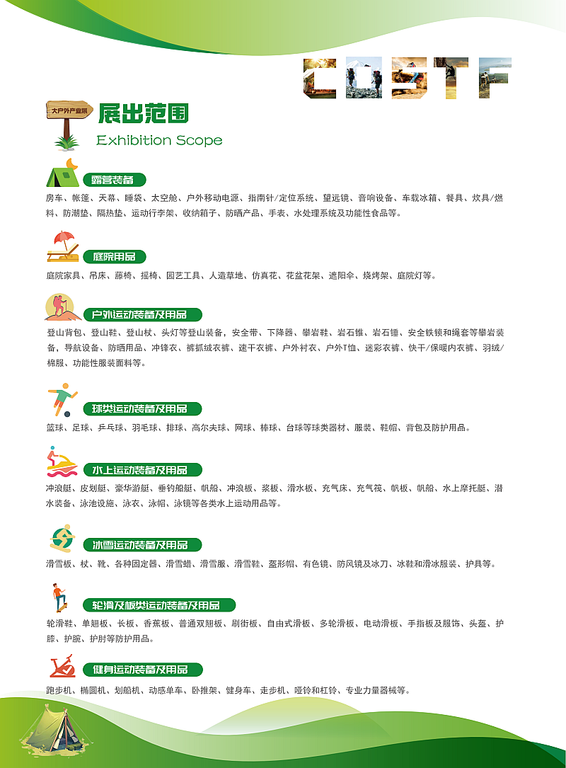 在此背景下,为全面展示我国户外生活及休闲运动产业发展的新成果,积极推介国内外知名户外、露营、体育运动用品品牌、产品,构建产品展示、贸易洽谈、高峰论坛、项目合作、赛事活动为一体的高端平台,中国户外生活及休闲运动用品交易博览会(简称“COSTF大户外产业展”)应运而生,大会将以专业化、市场化、信息化、国际化四维一体的办展目标,通过“展览+会议+赛事+体验”相结合的方式,致力于提高社会广大人民的生活品质,致力于发展户外运动产业对拉动内需、促进就业、扩大消费的积极作用,推动户外运动优质供给持续增加,为深入实施全民健身战略,改善人们的健康水平,增强体质,加快建设体育强国贡献力量。